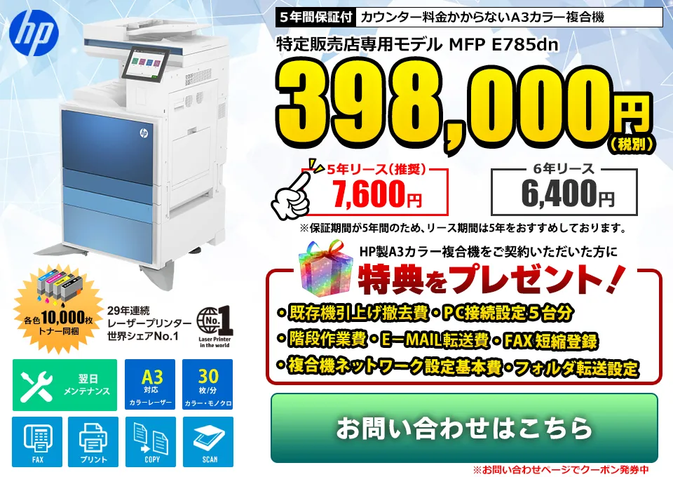 A.一般的には法定耐用年数で5年と定められています。弊社では定期連絡を行っておりますので、業務に支障をきたすことなく適切な時期に最新機種への入れ替えも可能です。